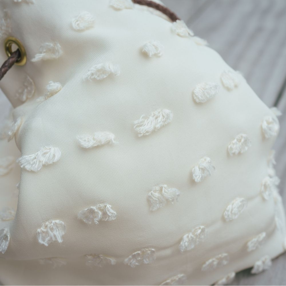 さりげなく揺れるフリンジ、とろんと柔らかな素材感、コロンとしたフォルムが愛らしい巾着スタイル。