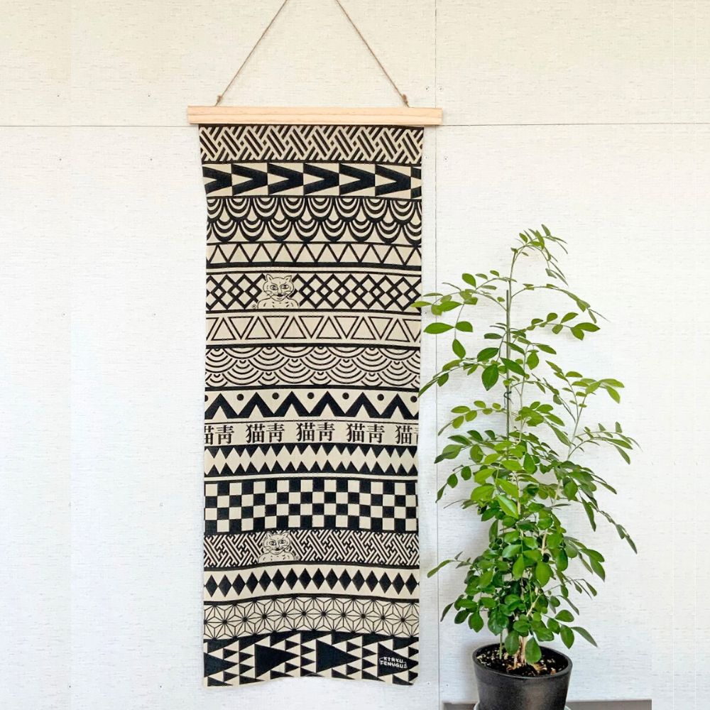 桐生てぬぐいのテーマそのものを感じる、古典的なモチーフをアレンジした、小粋でスタイリッシュな総柄デザイン。その中にこっそりと「靑猫」がひそんでいます。